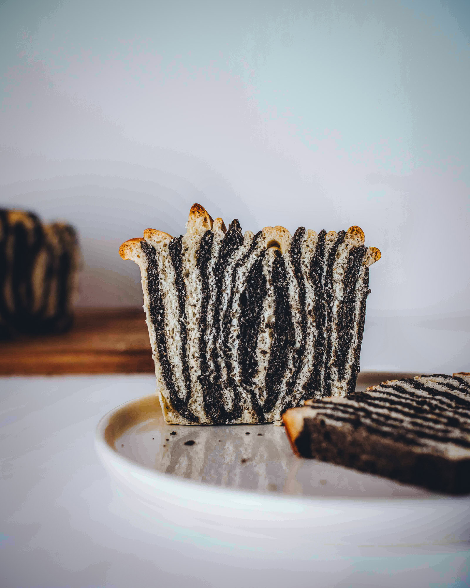 - Superposez les rectangles de pâtes, blancs et noirs, en alternant les couleurs, un blanc puis un noir et ainsi de suite. Graissez le moule et insérez le bloc de pâte dans le moule en le positionnant de telle sorte que le milieu du bloc de pâte soit au fond du moule et les bords du bloc de pâte soient orientés vers le haut (cette étape est importante pour obtenir l’effet zébré). Corrigez un peu pour obtenir un aspect régulier. Recouvrez d’un torchon et laisser lever jusqu’à ce que la pâte double à nouveau.