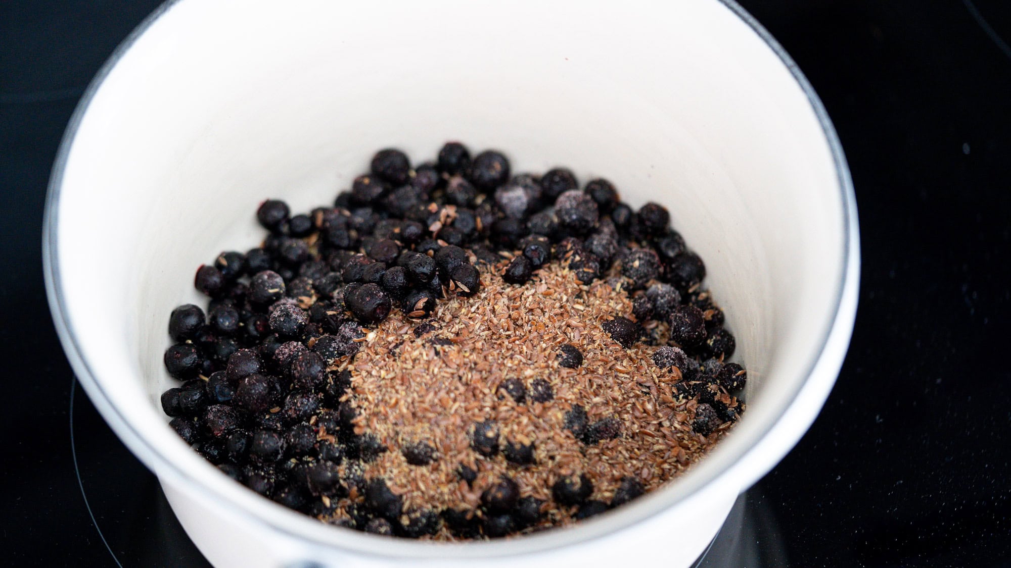- Dans une petite casserole, ajoutez les myrtilles, le sirop d’érable et les graines de lin.