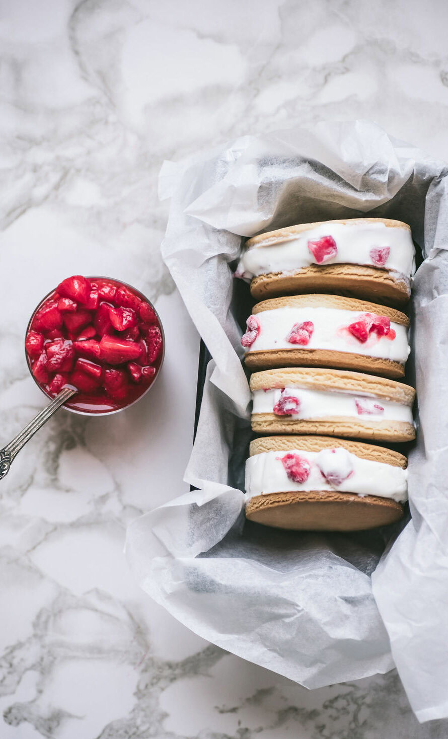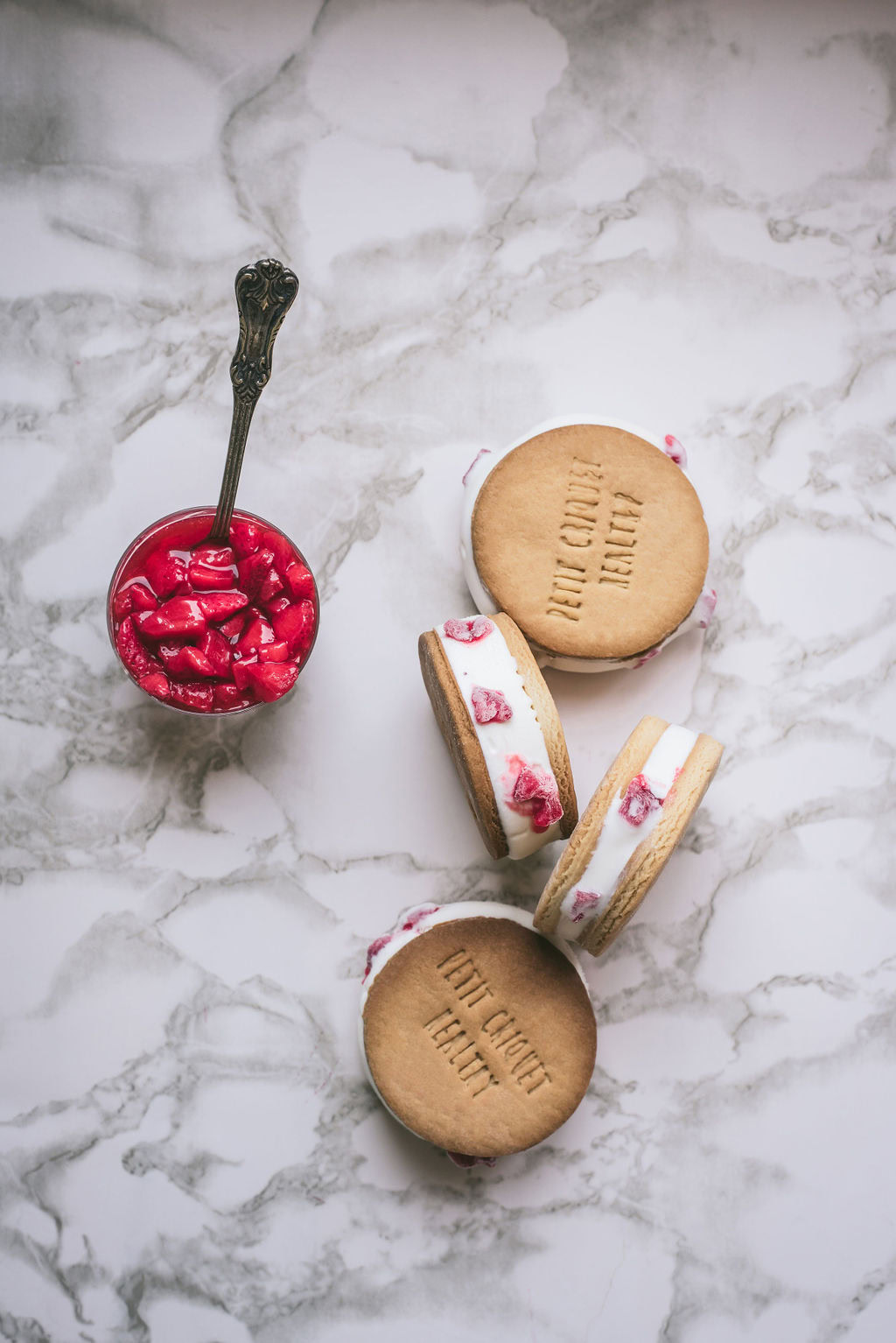 Une fois la préparation glacée prête, ajoutez les toppings, mélangez, puis montez vos sandwiches.