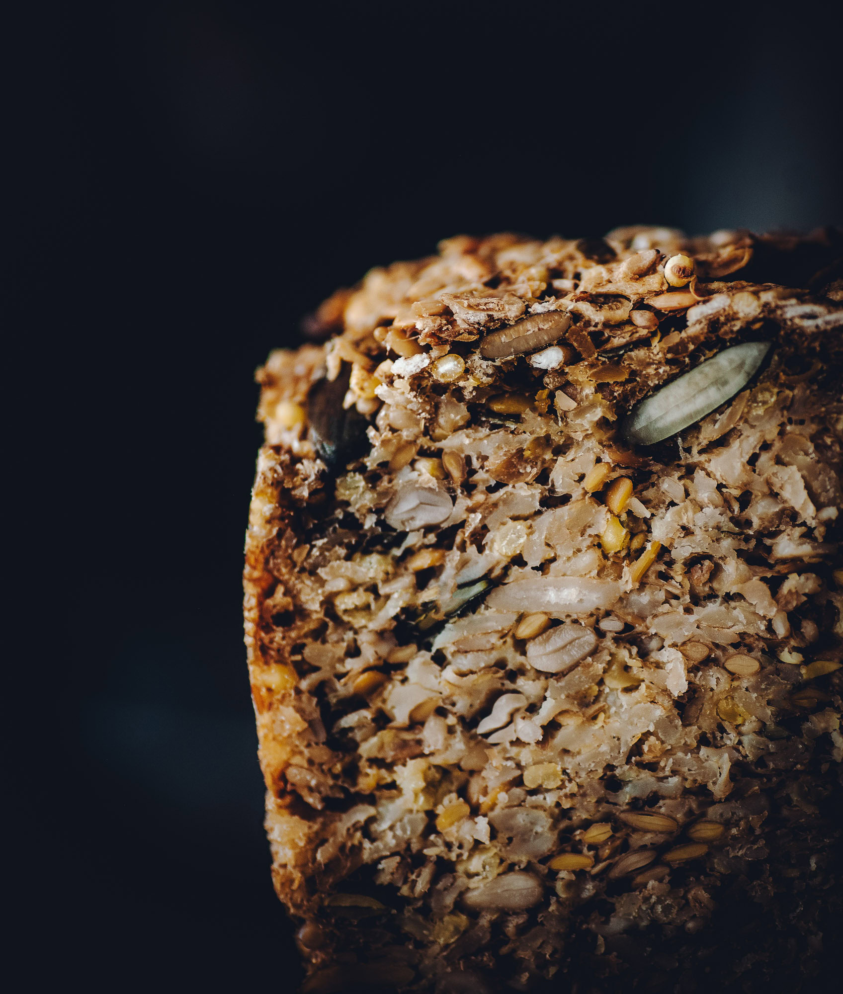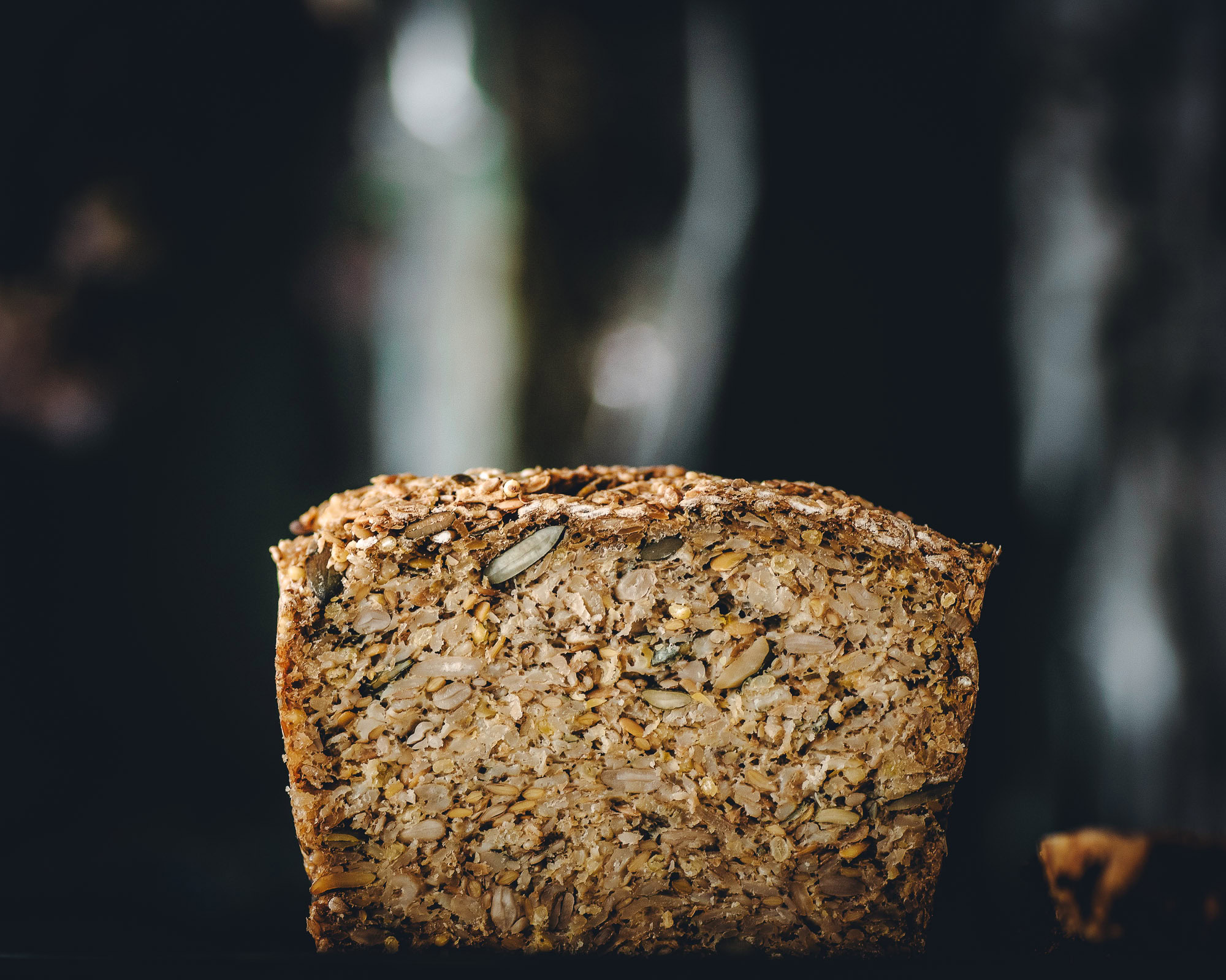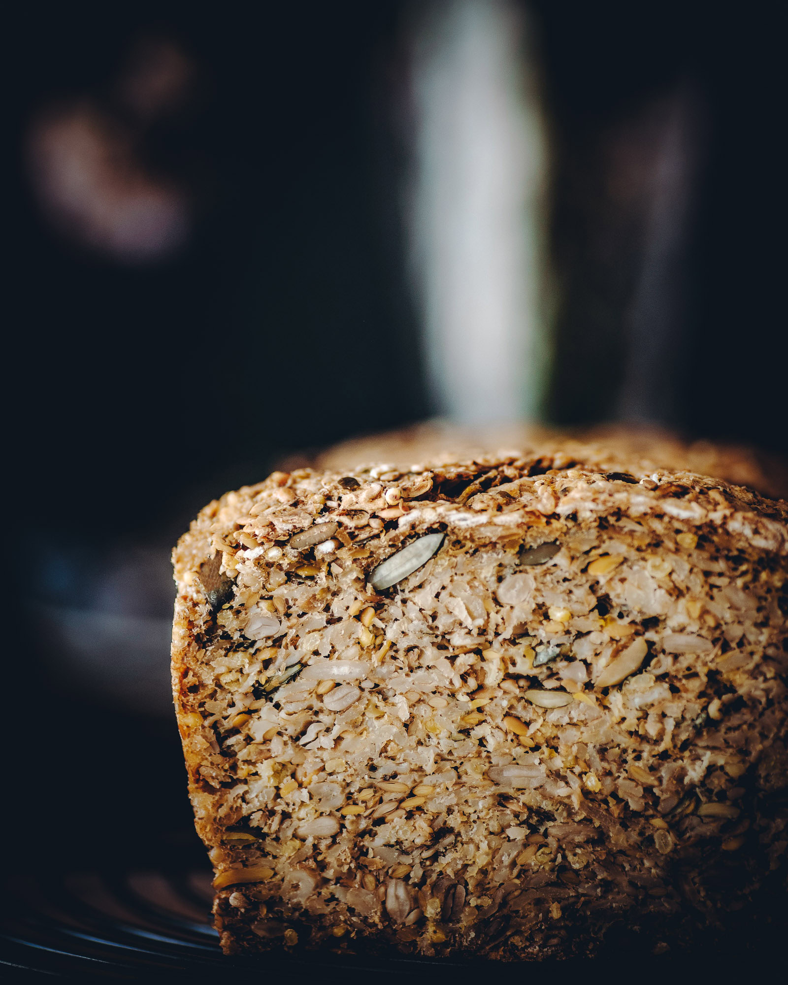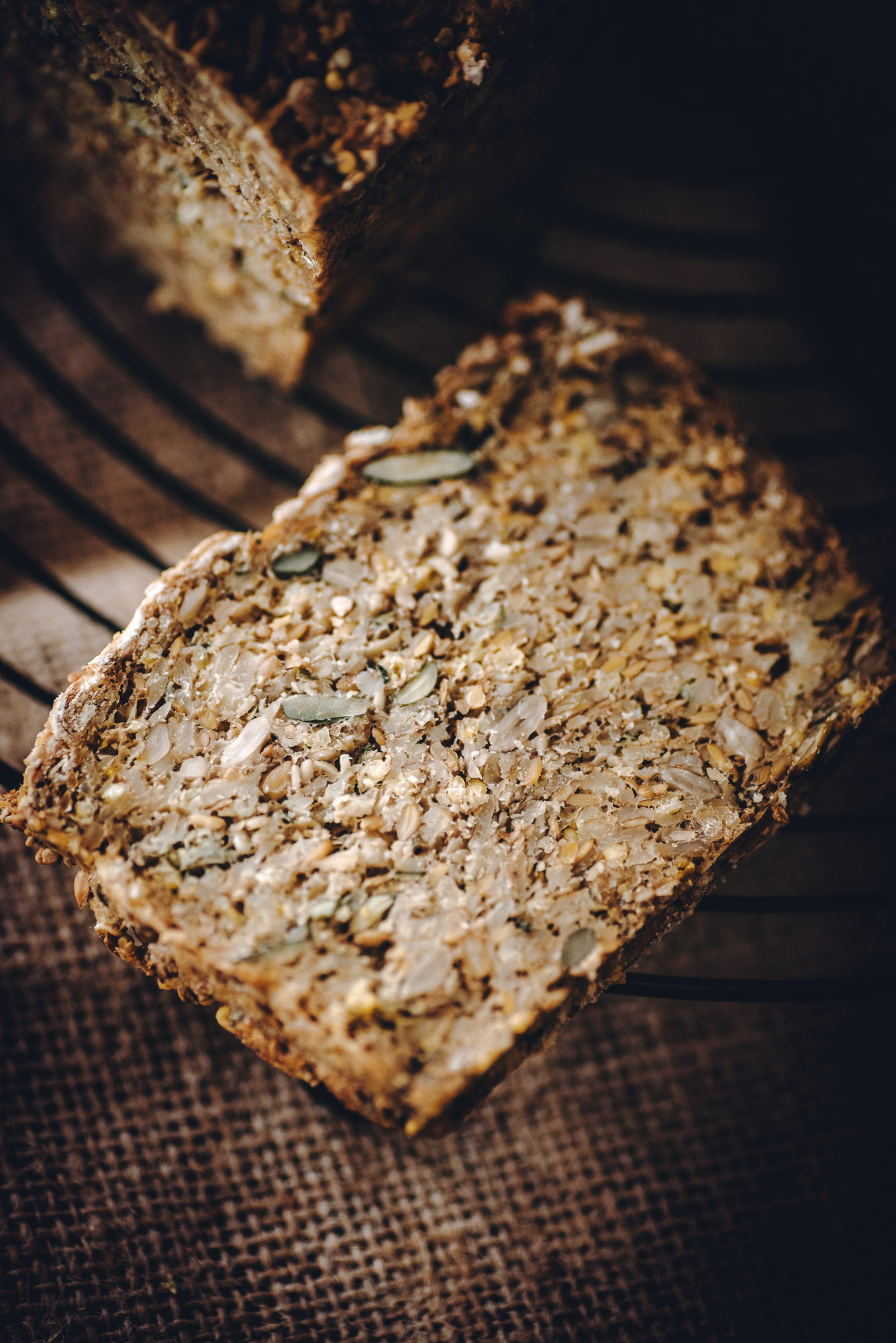 Ce pain sans farine blanche mise sur des ingrédients bruts comme les flocons et le son d’avoine pour une texture rustique et riche en fibres.