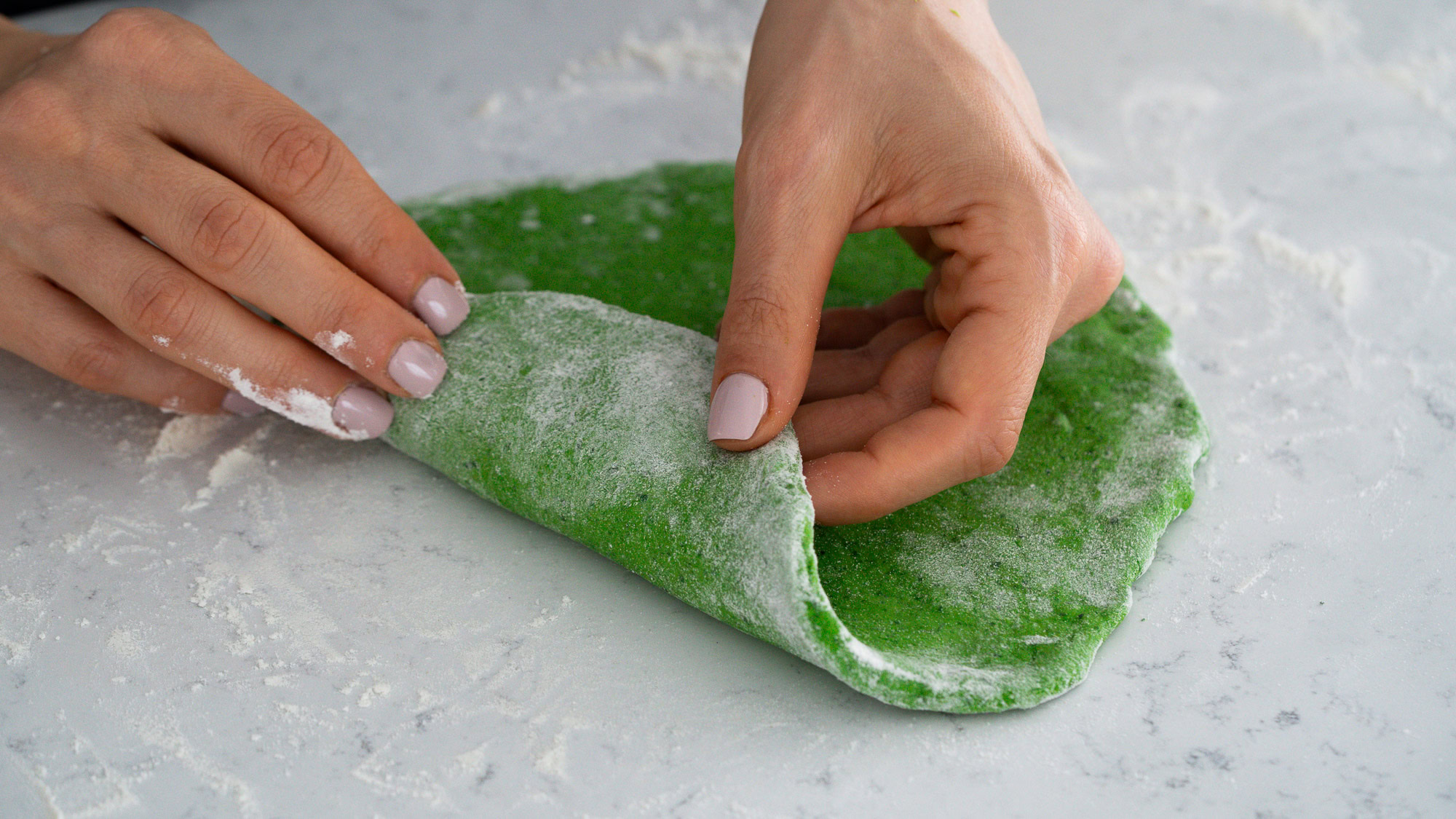 - Mixez les épinards avec la farine jusqu’à former une boule de pâte. Étalez en disque de 1 cm.