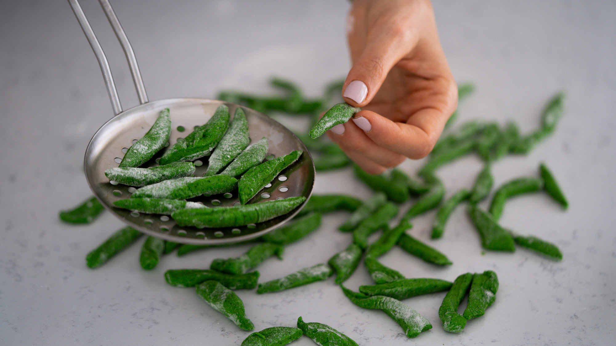 Des pâtes maison aux épinards servies avec une sauce crémeuse et protéinée aux herbes et aux petits pois. Une recette végétarienne simple, saine et gourmande.