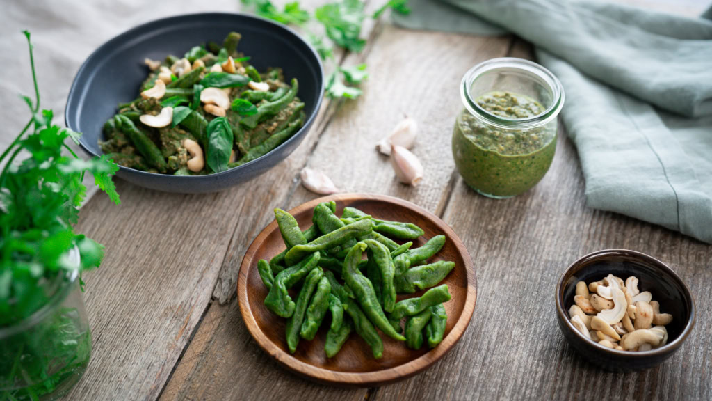 - Mélangez les pâtes avec la sauce. Garnissez de basilic frais et de noix de cajou concassées.