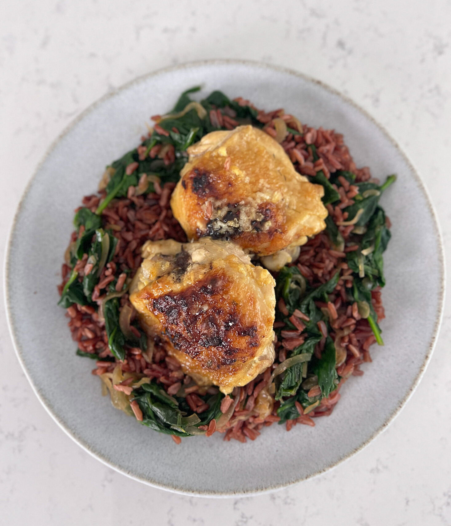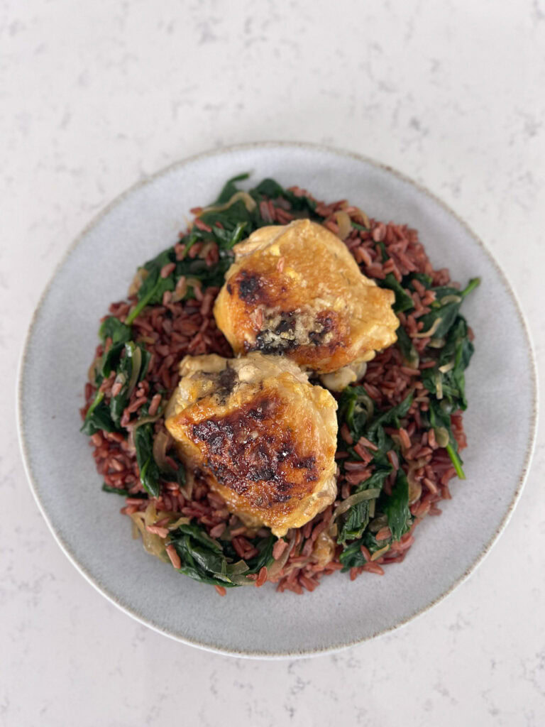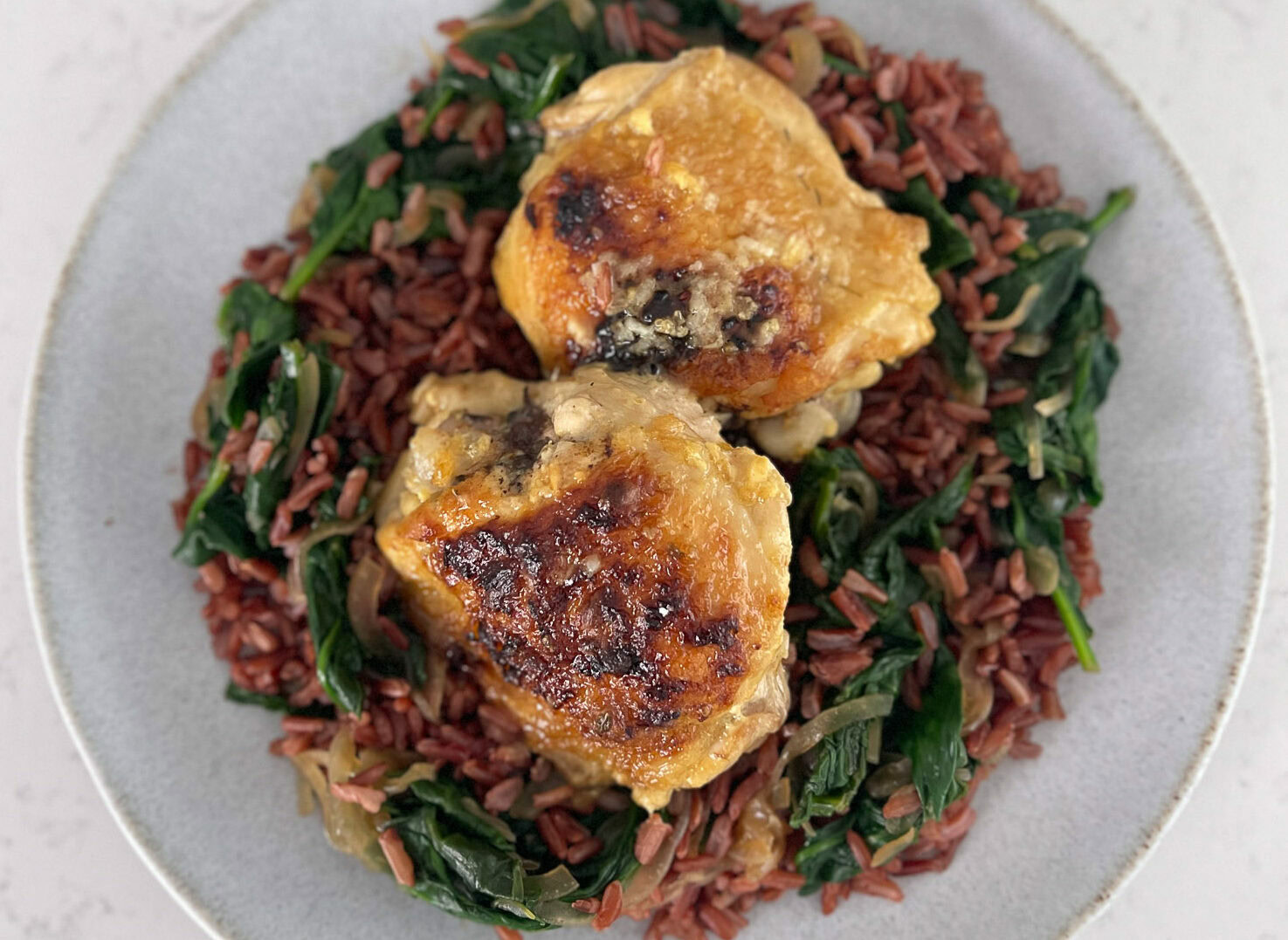Découvrez une recette simple et savoureuse inspirée du régime méditerranéen : des cuisses de poulet marinées au citron et aux herbes, accompagnées d’épinards sautés et de riz complet. Un repas équilibré et gourmand, riche en saveurs et en bienfaits pour votre santé.