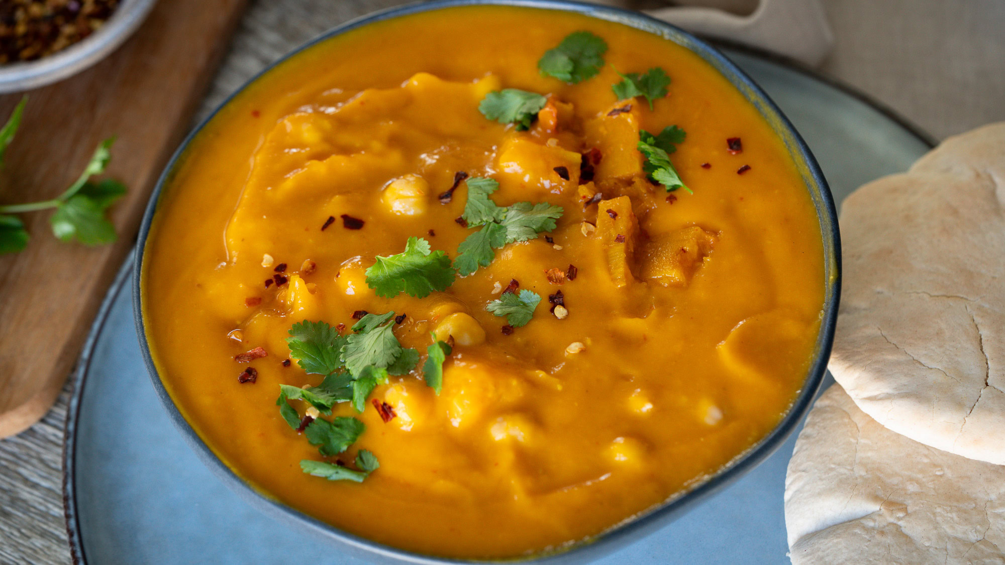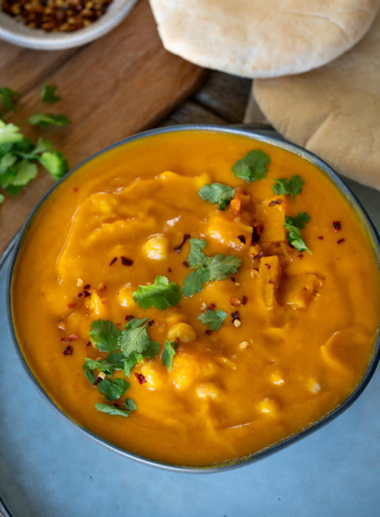La courge apporte des fibres et des caroténoïdes, les pois chiches assurent la dose de protéines végétales, et le curry donne cette touche chaude et épicée qui réveille le tout.