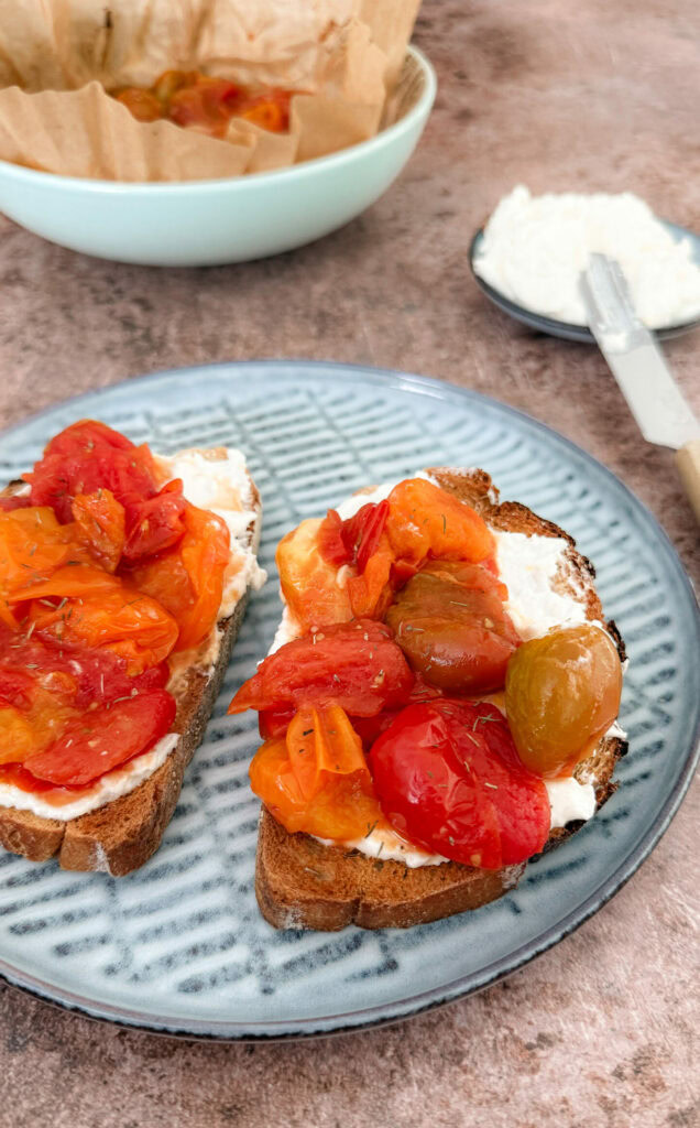 Répartissez les tomates cerises rôties et écrasées sur le fromage fouetté.