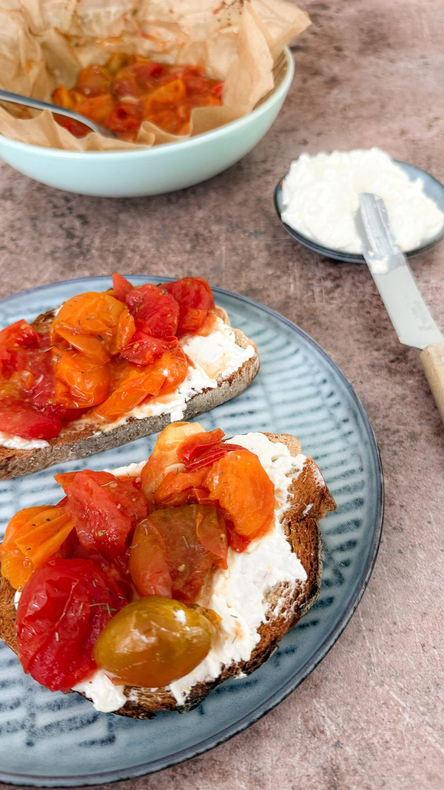 Répartissez les tomates cerises rôties et écrasées sur le fromage fouetté.
